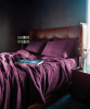 Pliurile cad ca un val cald și domol, iar tonul bogat de prună învăluie patul într-o lumină de seară care liniștește privirea și ordonează spațiul. Lucirile subtile se joacă pe suprafață ca o dantelă de umbră, adâncind culoarea și dând volum așternutului. Totul respiră tihnă și măsură: contururi curate, rafinament în șoaptă și acea eleganță fără efort care transformă rutina nopții într-un mic ritual.